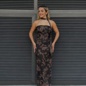 Vestido cai cai forrado tons de castanho e preto